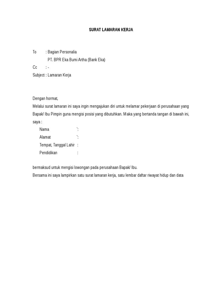 Contoh surat lamaran kerja di bank bca untuk berbagai posisi. Bekerja di bank memang punya nilai tersendiri. Berdasarkan informasi lowongan kerja di mana diinformasikan bank sejahtera membutuhkan karyawan untuk posisi teller, dengan surat . Ada banyak bank seperti bank bni, bri, btn, mandiri dan bank lainnya yang membuka lowongan pekerjaan untuk posisi teller. Contoh surat lamaran kerja bank mandiri. Bekerja di perbankan mungkin jadi impian banyak orang, oleh karena itu butuh dipersiapkan surat lamaran kerja di bank yang baik dan benar. Bp/ibu pimpinan bank mandiri (persero) . Contoh surat lamaran kerja di bank · 1. Contoh surat lamaran kerja di bank sering kali dibutuhkan bagi pelamar kerja yang belum terbiasa membuatnya. Yuk, lihat contohnya di sini! Buat anda yang akan melamar, inilah contoh surat lamaran kerja di bank yang bisa anda gunakan. Contoh surat lamaran kerja di bank bca adalah contoh lamaran pekerjaan terbaru yang akan admin bagikan sore ini untuk anda yang ingin melamar pekerjaan di . Surat permohonan ketenagakerjaan di bank bca sebenarnya tidak terlalu berbeda dengan surat .